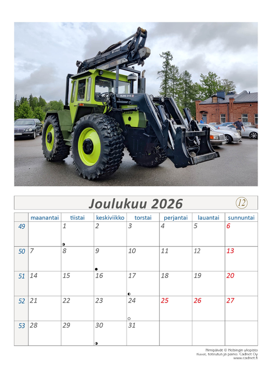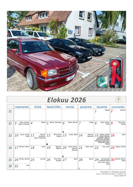 Mersuharrastajien vapaamuotoinen - Itätähti - tapahtuma jossa ovat vierailleet Mersuharrastajia ympäri Suomen. Suomalaiset vieraili Saksassa tapahtumassa jossa palkittiin mm. IPI ja kaukaisin mukana ollut Joensuusta. Kesän tapahtumien kuvista on koostettu kalenteri vuodelle 2026. Osta tämä uniikki kalenteri itsellesi, ystävälle tai liikelahjaksi. Kalenterissa on viikot, nimipäivät, juhlapäivät, liputuspäivät, kuunvaiheet. Kaikki valmistamamme kalenterit ovat tekijänoikeuslain alaisia, ja niiden kopiointi on ehdottomasti kielletty.Toteuttaja Cadnet Oy Elimäen Kukkomäellä.